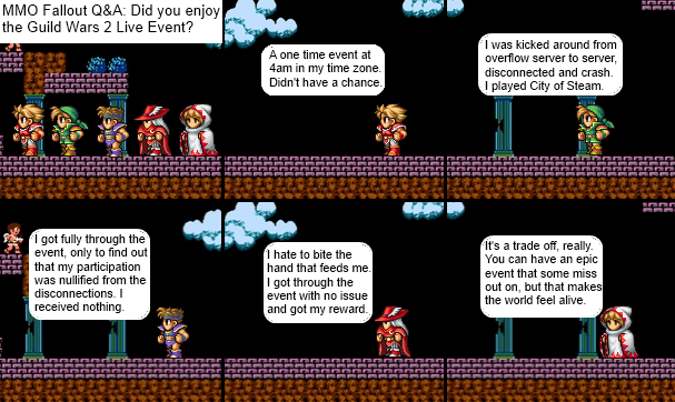 Live events are a trade-off. On one hand, they’re often a massive, lag-riddled clustertruck of players scrambling over one another in an attempt to get their participation noted, leaving out those in other time zones. On the other hand, if you did attend the live event as I did, the sight of the world permanently changing before your eyes offers a new level of immersion. It’s something that if you were there, cool, if you weren’t, you feel left out.
