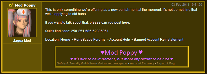 The official response from Jagex (Mark H) is that these fees are being used to fund the ICU (Internal Conflicts Unit?) so that less membership fees and advertising revenue have to be used to fund it. Jagex’s official policy appears to be that cheaters should have to pay to fund the staff that have to look through their appeals. Again, the specifics are something Jagex refuse to release, so we’ll have to wait until someone is given this offer before we can talk specifics.